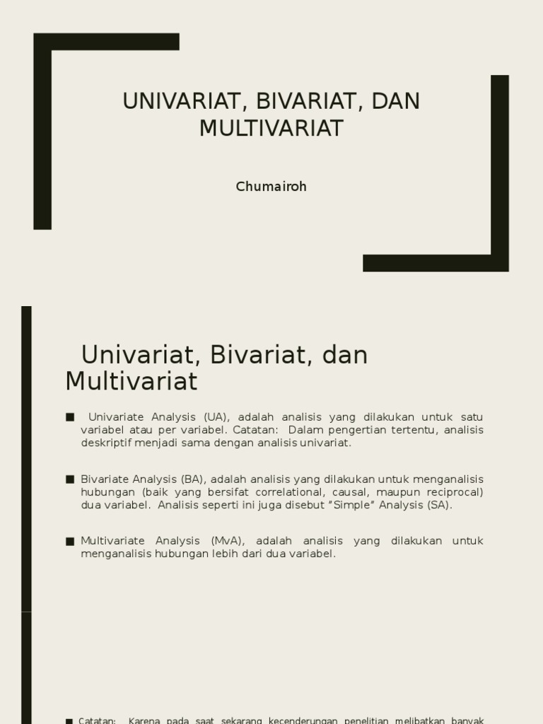 Analisis Univariat Dan Bivariat Ppt Download from slideplayer.info Analisis data merupakan proses untuk menyederhanakan data dalam bentuk yang lebih mudah kamu bisa memilih teknik univariat jika penelitianmu terdiri dari satu variabel saja, terutama untuk. Analisis univariat adalah analisis yang dilakukan terhadap sebuah variabel. Analisa univariat berfungsi untuk meringkas kumpulan data. Pengertian analisis univariate, bivariate dan multivariate, mata kuliah biostatistik pengertian analisis. Kata analisis diadaptasi dari bahasa inggris analysis yang secara etimologis. 2 analisis univariat ukuran pemusatan ukuran penyebaran mean, median, modus ukuran penyebaran standard deviasi, variansi, range. Penelitian analisis univariate adalah analisa yang dilakukan menganalisis tiap variabel dari hasil penelitian (notoadmodjo, 2005 : Setelah dilakukan pengumpulan data, langkah berikutnya adalah melakukan pengolahan data agar data yang masih terkesan bertebaran dapat disusun sehingga lebih.